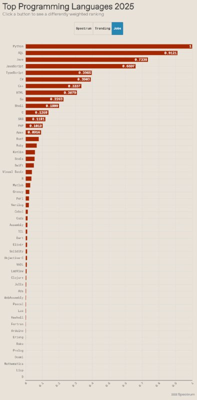 在“ Spectrum ”默认排名中(该排名考虑了 IEEE 成员的利益),我们看到Python再次占据榜首,前五名中变化最大的是JavaScript,从去年的第三名跌至今年的第六名。由于JavaScript通常用于创建网页,而 vibe 编码通常用于创建网站,因此这种明显流行度的下降可能是由于人工智能的影响,我们稍后会深入研究。在“Jobs”排名中,该排名专门关注雇主所寻求的技能,我们看到Python也从去年的第二名上升至第一名,不过SQL专业知识仍然是简历中一项非常有价值的技能。